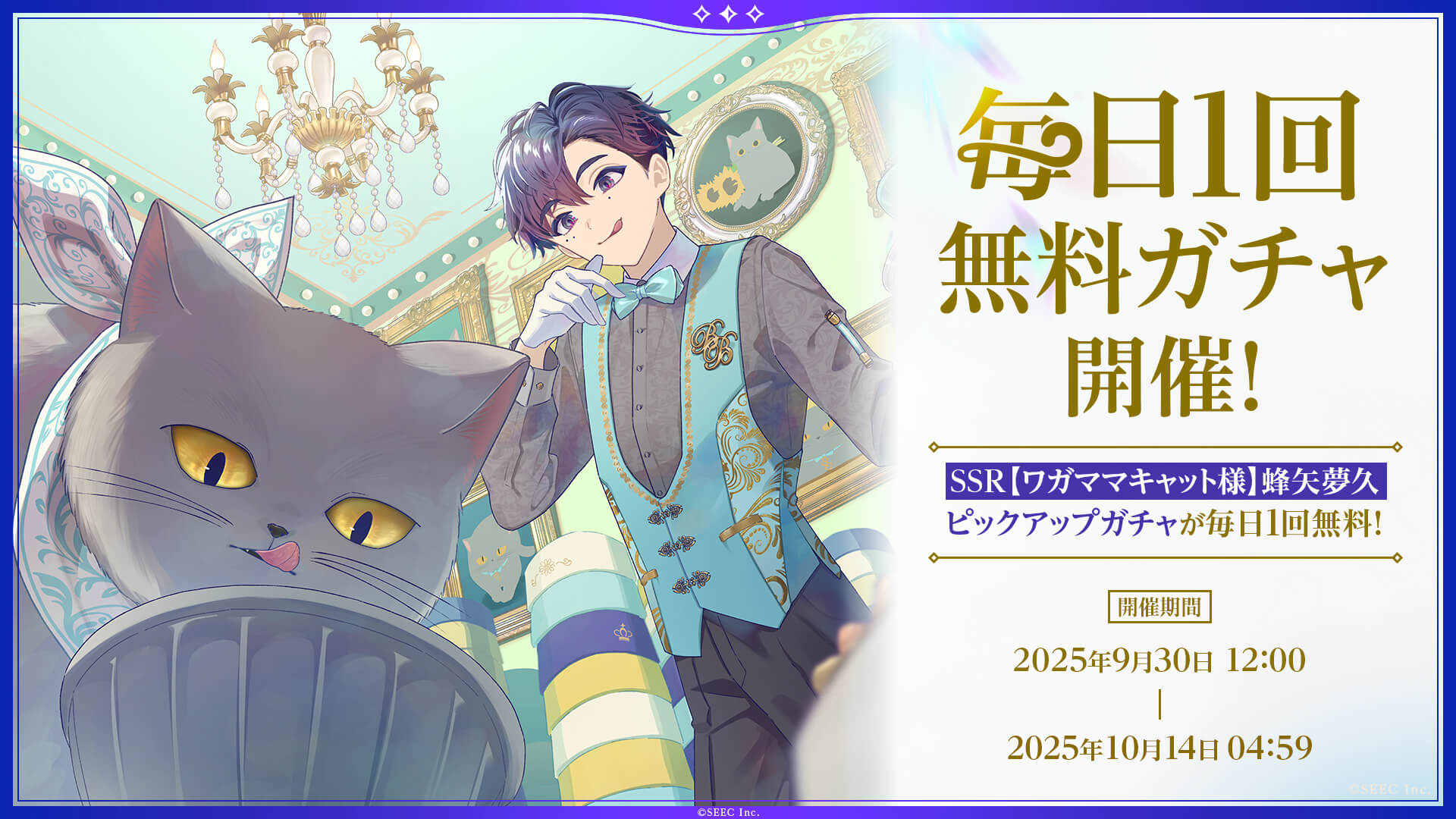 9/30 正午より開催の【ワガママキャット様】蜂矢夢久 ピックアップガチャが毎日1回無料で引くことができます!