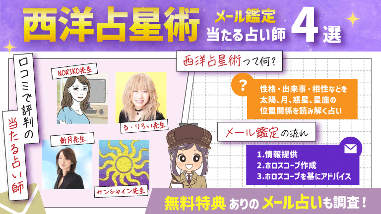 今回は西洋占星術メール鑑定の利用を検討されている方のために、メール占いが当たる占い師を調査し、詳細を紹介しました。