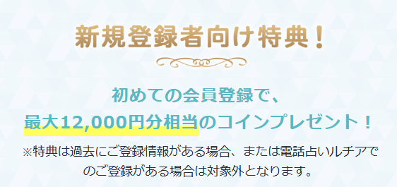 無料特典 | [slash-13px:対象の占い師3人まで] 初回 10分無料 [pleiades-17px:合計最大30分無料] | [slash-13px:対象の占い師5人まで] 初回 10分無料 [pleiades-ruby-17px:合計最大50分無料] | [slash-13px:対象の占い師5人まで] 初回 10分無料 [pleiades-ruby-17px:合計最大50分無料] | [slash-13px:対象の占い師7人まで] 初回 10分無料 [pleiades-emerald-17px:合計最大70分無料] | [slash-13px:1分100円の占い師なら] 初回 30分無料 [pleiades-17px:会員登録で3,000円無料] | [slash-13px:すべての占い師から選択] 初回 20分無料 [pleiades-17px:会員登録で4,000円無料] | [slash-13px:新規登録で5,000円分] 初回 15分無料 [pleiades-17px:合計最大12,000円分無料] | [slash-13px:新規登録で6,500円分] 初回 15分無料 [pleiades-17px:合計最大7,500円無料] | [slash-13px:1分190円の占い師なら] 初回 15分無料 [pleiades-17px:合計最大3,000円無料] | [slash-13px:1分200円の占い師なら] 初回 15分無料 [pleiades-17px:会員登録で3,000円無料] | [slash-13px:新規登録で3,000円分] 初回 10分無料 [pleiades-17px:合計最大9,000円無料] | [slash-13px:1分240円の占い師なら] 初回 10分無料 [pleiades-17px:最大2,400円無料] | [slash-13px:全占い師OK] 初回 10分無料 [pleiades-17px:合計最大8,000円無料] | [slash-13px:1分230円の占い師なら] 初回 10分無料 [pleiades-17px:会員登録で2,400円無料] | [slash-13px:1分250円の占い師なら] 初回 10分無料 [pleiades-17px:会員登録で2500円無料] | [slash-13px:全占い師OK] 初回 10分無料 [pleiades-17px:全占い師初回10分無料鑑定] | [slash-13px:1分250円の占い師なら] 初回 10分無料 [pleiades-17px:会員登録で2,400円無料] | [slash-13px:1分260円の占い師なら] 初回 10分無料 [pleiades-17px:会員登録で8,000円無料] | [slash-13px:初めて鑑定を受ける先生限定] 初回 10分無料 [pleiades-17px:毎月1回10分無料] | 初回 10分無料 | 初回 10分無料 | [slash-13px:1分220円の占い師なら] 初回 11分無料 [pleiades-17px:会員登録で2,500円無料] | [slash-13px:1分270コインの占い師なら] 初回 10分無料 [pleiades-17px:会員登録で5,500円無料] | [slash-13px:初指名の占い師なら] 初回 5分無料 | [slash-13px:初指名の占い師なら] 初回 5分無料 |